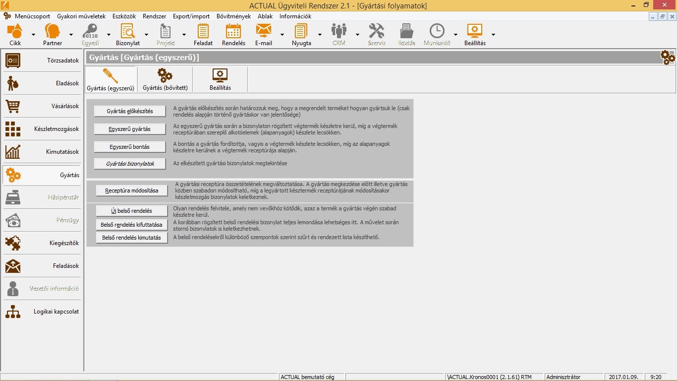 Elsődlegesen gyártási folyamatok lépéseinek követésére és a készletek kezelésére szolgál az ajánlattól a végteljesítésig, partnereink és cikkeink adatainak rögzítését és nyilvántartását, raktárak kezelését, belföldi számlakészítést és automatikus leltározást is lehetővé téve. Korlátlan számú felhasználó nyilvántartása mellett egy egyidejű felhasználói bejelentkezést biztosítva.