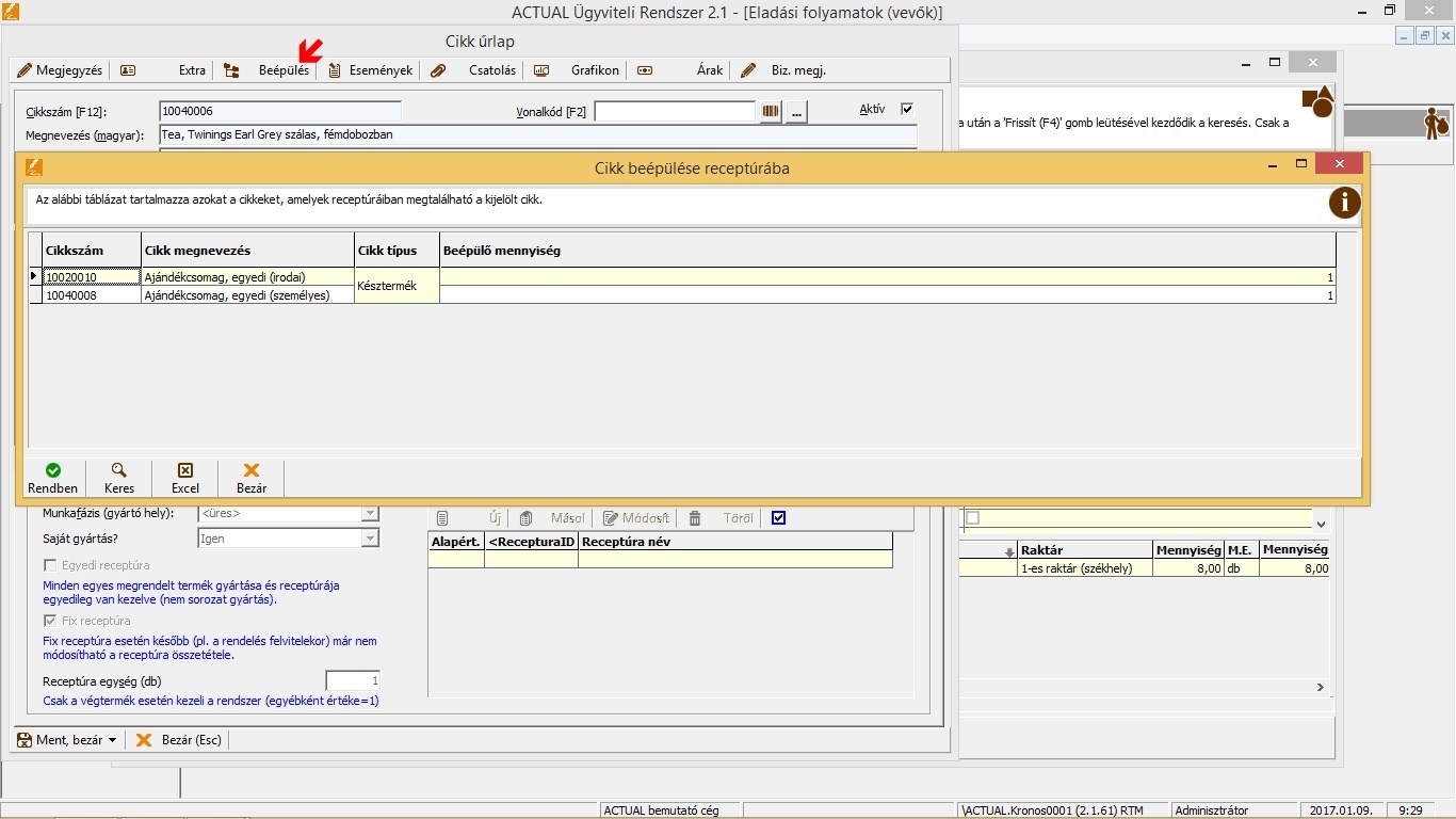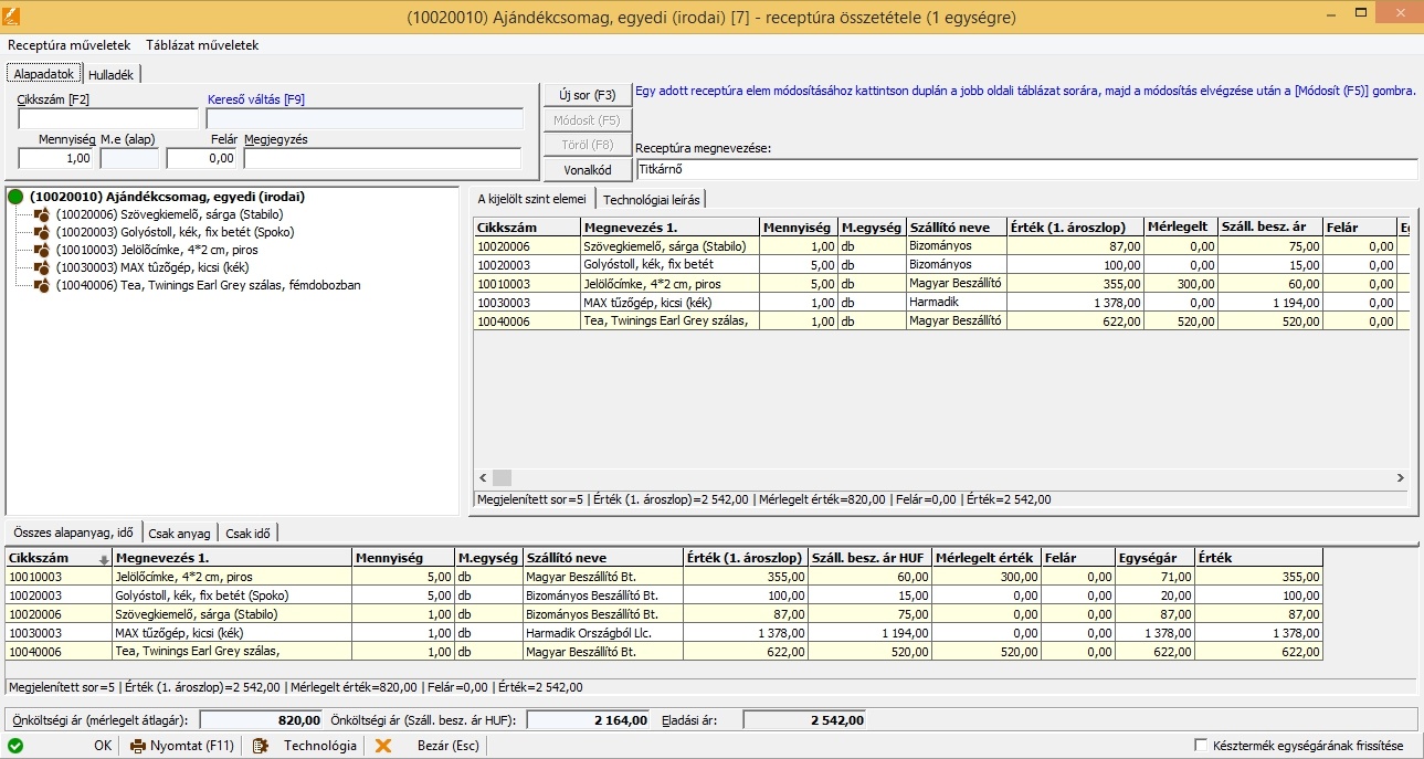 • korlátlan mélységű receptúra (darabjegyzék) rögzítése a cikk törzslapján