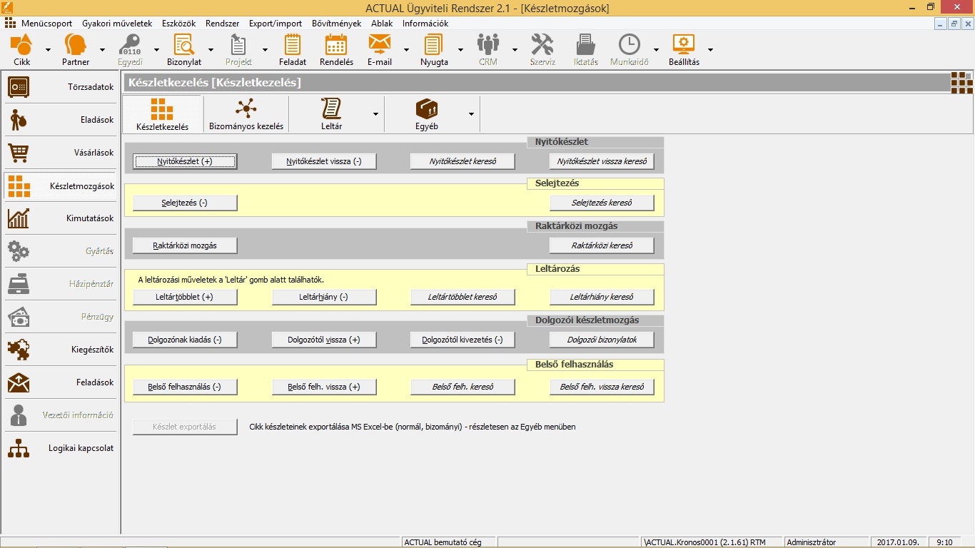 Elsődlegesen raktárkészleteink kezelésére, partnereink és cikkeink adatainak rögzítésére és nyilvántartására szolgál, belföldi számlakészítést és automatikus leltározást lehetővé téve. A Naplózás modullal kiegészítve a NAV által is jóváhagyott módon alkalmas jövedéki nyilvántartás vezetésére.