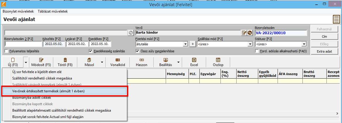 - Bizonylat űrlapon az [Új] sor melletti menüben új menüpontok: