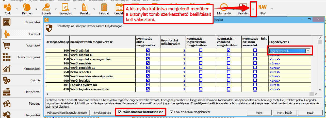 - Bizonylatok engedélyezése