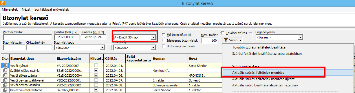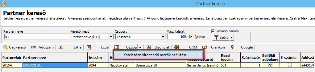 - Kereső gombokra ráhúzva automatikusan az adott partner neve kitöltésre kerül.